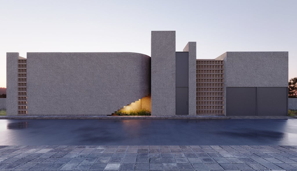 En su exterior Casa Amuzgos usa como material principal el acabado rústico , un acabado que puede fácilmente pasar desapercibido , para así poder me matizarse con su contexto de una manera más eficiente.